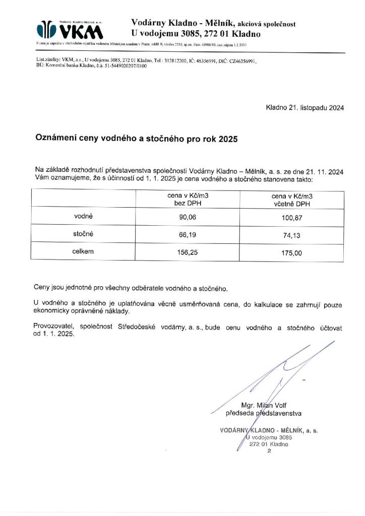 představenstvo společnosti Vodárny Kladno – Mělník, a.s (VKM) na svém zasedání 21. listopadu 2024 stanovilo cenu vodného a stočného pro rok 2025: