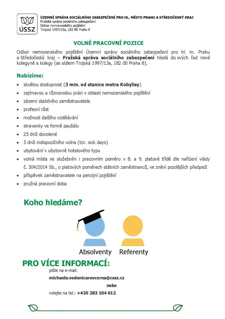 Vážení občané, níže naleznete informaci o nabídce zaměstnání z Pražské správy sociálního zabezpečení.