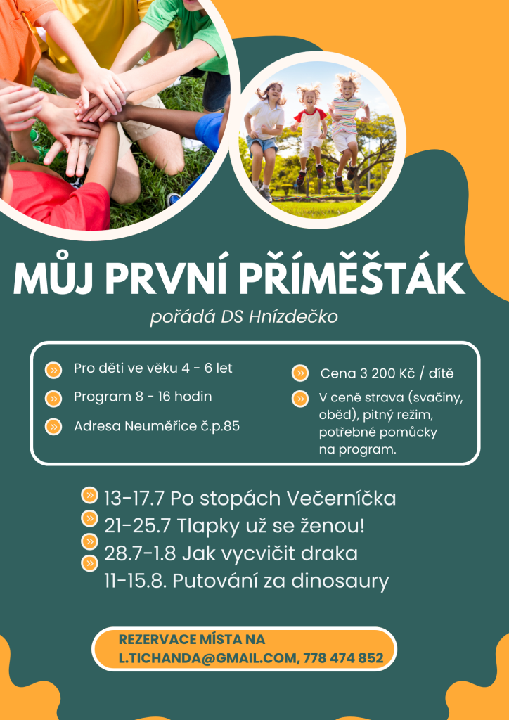 Příměstský tábor pro děti ve věku 4-6 let nabízí pestrý program plný dobrodružství. V Neuměřicích si děti mohou užít různé tematické týdny, jako jsou "Po stopách Večerníčka", "Tlapky už se ženou!" a další. Cena tábora je 3200 Kč za dítě a zahrnuje stravu, pitný režim a potřebné pomůcky. Program probíhá od 8 do 16 hodin v termínech 13.-17.7., 21.-25.7., 28.7.-1.8. a 1.-15.8. Adresa konání je Neuměřice č.p.85.